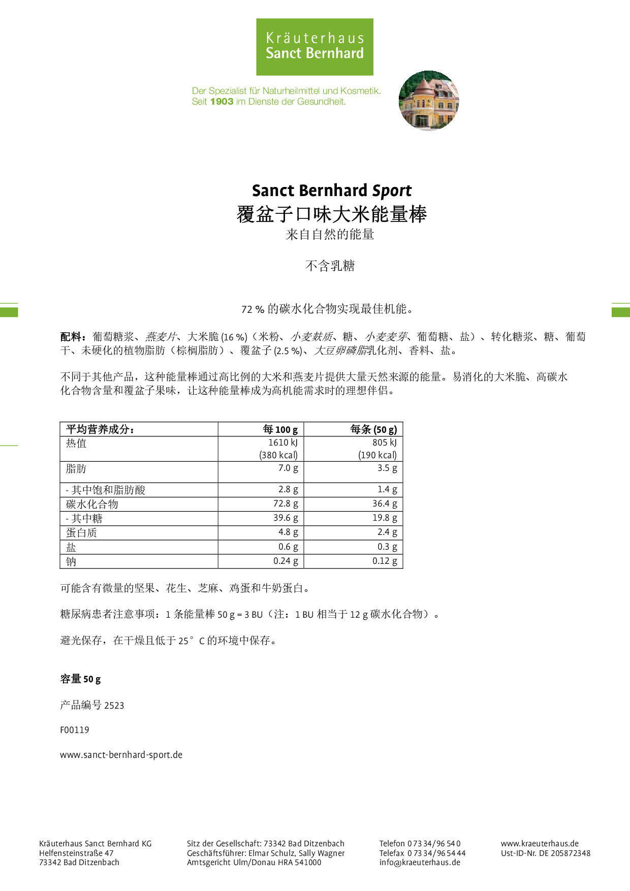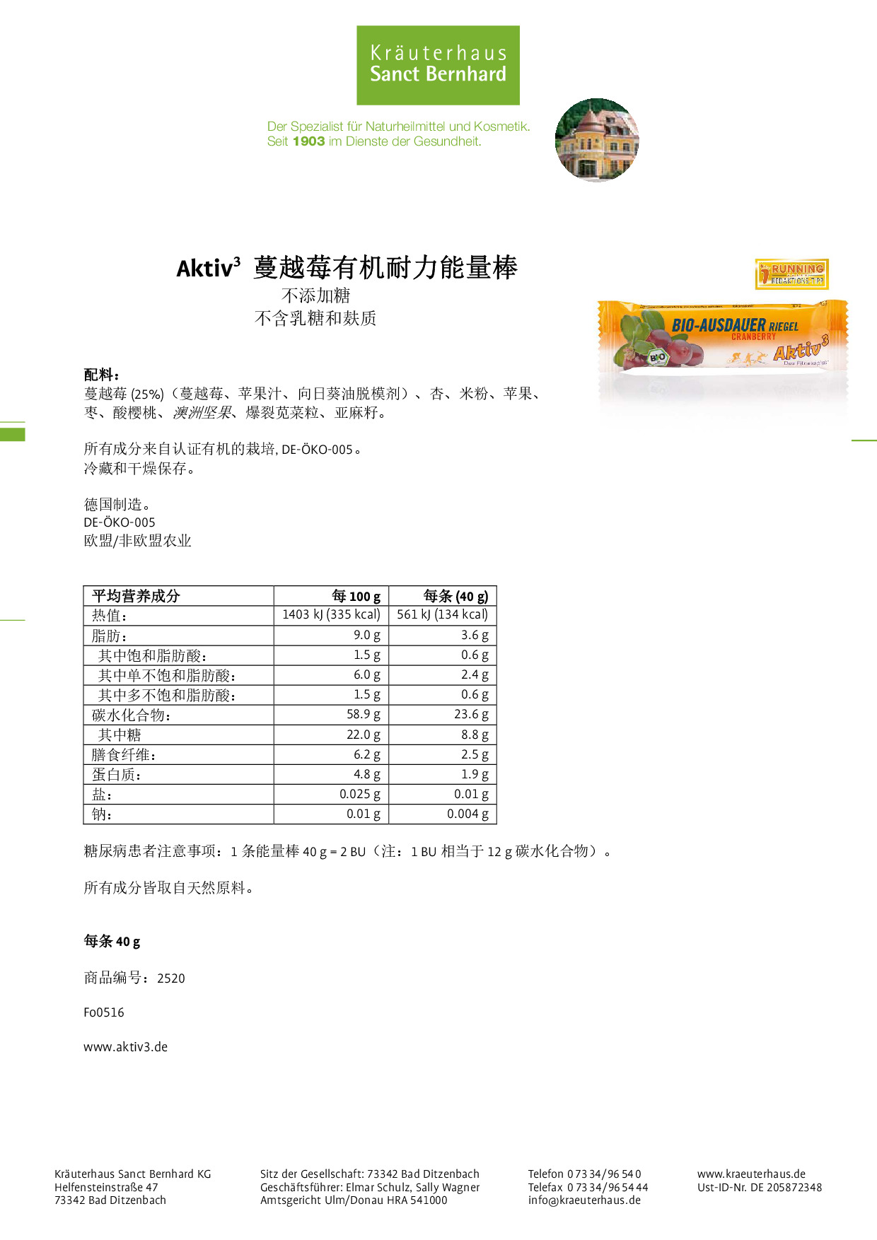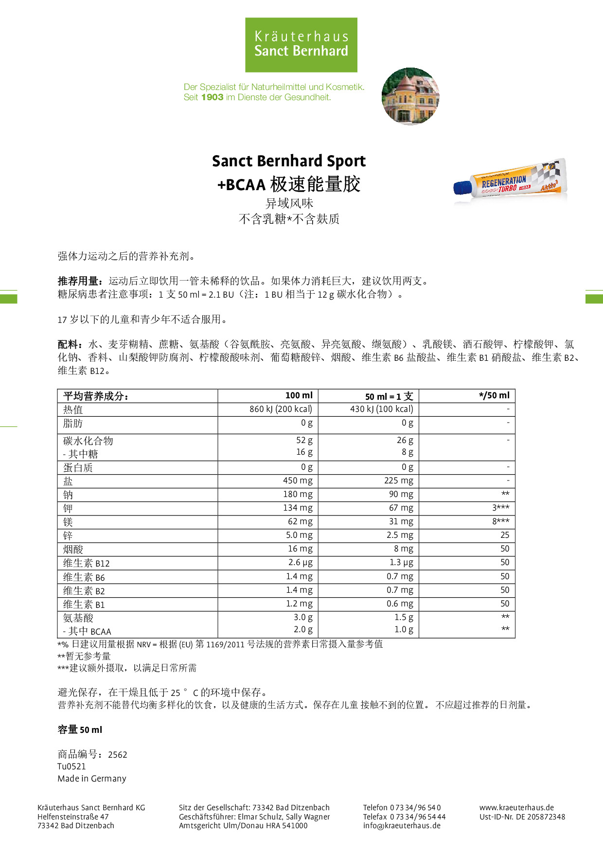 蜜桃西番莲等渗能量饮品配料:麦芽糊精、蔗糖、酸味剂:柠檬酸、乳酸钙、氯化钠、柠檬酸三铵、柠檬酸三钾、香料。 酸樱桃等渗能量饮品配料:麦芽糊精、蔗糖、酸味剂:柠檬酸、乳酸钙、氯化钠、柠檬酸三铵、柠檬酸三钾、香料。 石榴味高档体能恢复饮品 配料:麦芽糊精、蔗糖、柠檬酸酸味剂、柠檬酸三钾、柠檬酸三铵、香料、烟酸、维生素 B6 盐酸盐、维生素 B1 硝酸盐、维生素 B2。 蜜桃西番莲口味能量胶 配料:水、麦芽糊精、蔗糖、氯化钠、柠檬酸三钾、山梨酸钾防腐剂、香料、柠檬酸酸味剂。 蔓越莓有机耐力能量棒 配料:蔓越莓 (25%)(蔓越莓、苹果汁、向日葵油)、杏、米粉、酸樱桃、苹果、枣、澳洲坚果、爆裂苋菜粒、亚麻籽。 覆盆子口味大米能量棒 配料:葡萄糖浆、燕麦片、大米脆 (16 %)(米粉、小麦麸质、糖、小麦麦芽、葡萄糖、盐)、转化糖浆、糖、葡萄干、未硬化的植物脂肪(棕榈脂肪)、覆盆子 (2.5 %)、大豆卵磷脂乳化剂、香料、盐。 苹果口味大米能量棒 配料:燕麦片、葡萄糖浆、大米脆 (16%)(米粉、小麦麸质、糖、小麦麦芽、葡萄糖、盐)、转化糖浆、葡萄干、糖、未硬化的植物脂肪(棕榈脂肪)、麦芽糊精、苹果 (1.9%)、小麦淀粉、大豆卵磷脂乳化剂、盐、香料。 芒果口味大米能量棒 配料:燕麦片、葡萄糖浆、转化糖浆、大米脆 (16%)(米粉、小麦麸质、糖、小麦麦芽、葡萄糖、盐)、葡萄干、糖、未硬化的植物脂肪(棕榈脂肪)、麦芽糊精、芒果 (3.1%)(芒果、糖、柠檬酸酸味剂)、小麦淀粉、大豆卵磷脂乳化剂、盐、香料。 +BCAA 极速能量胶 配料:水、麦芽糊精、蔗糖、氨基酸(谷氨酰胺、亮氨酸、异亮氨酸、缬氨酸)、乳酸镁、酸度调节剂(酒石酸钾、柠檬酸钾)、氯化钠、香料、山梨酸钾防腐剂、柠檬酸酸味剂、葡萄糖酸锌、烟酸、维生素 B6 盐酸盐、维生素 B1 硝酸盐、维生素 B2、维生素 B12。 Vital 活力护肤乳 成分:水、棕榈酸异丙酯、液体石蜡、鲸蜡硬脂醇、丙二醇、鲸蜡硬脂醇聚醚-12、药用鼠尾草叶提取物、异株荨麻叶提取物、问荆提取物、西洋蓍草叶提取物、蜜蜂花叶提取物、七叶树叶提取物、金缕梅叶提取物、金缕梅花水、迷迭香叶提取物、金丝桃提取物、洋甘菊提取物、麝香草叶提取物、红芒柄花根提取物、棕榈酸视黄酯、樟脑、薄荷醇、生育酚、向日葵籽油、亚油酸、亚麻酸、柠檬酸、甘油、鲸蜡硬脂酰硫酸钠、乙醇、丁二醇、氢氧化钠、苯氧基乙醇、脱氢乙酸、苯甲酸、对羟基苯甲酸甲酯、对羟基苯甲酸乙酯、对羟基苯甲酸丙酯、CI 75810、香料、精油混合物(柠檬烯、芳樟醇、丁子香酚、柠檬醛 - 取自天然精油)。 Fireprotect 护肤霜 成分:凡士林、液体石蜡、野大豆油、白桦树皮提取物、金盏花提取物、胡萝卜根提取物、β-胡萝卜素、生育酚。